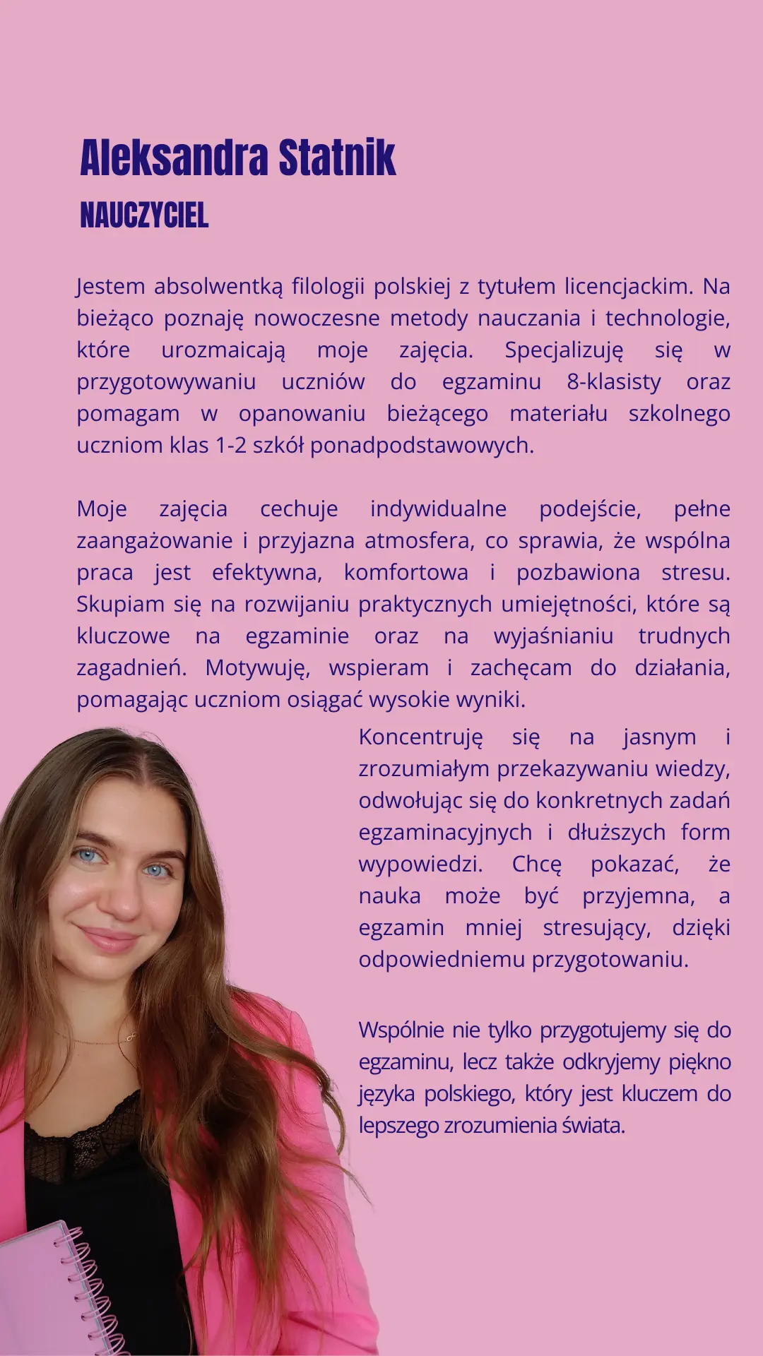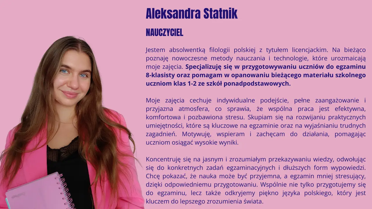 Zapraszamy na kurs przygotowujący do egzaminu ósmoklasisty z języka polskiego, na którym najważniejsze są konkrety i praktyka. Uczymy zagadnień w 100% zgodnych z wymaganiami egzaminacyjnymi.