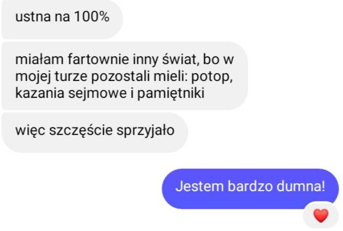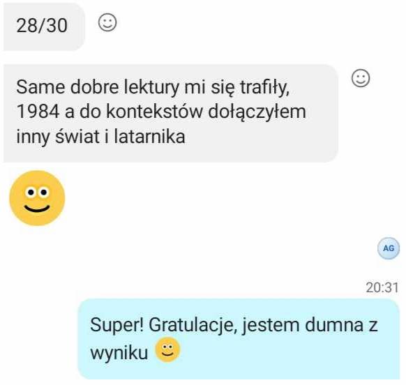 Tak. Zakończenie zajęć z danego tematu maturą ustną to świetna powtórka z lektury. Wspólnie opracowujemy pytania z listy jawnej, dzięki czemu matura ustna nie będzie już stresującą sytuacją. Na lekcji panuje bardzo przyjazna atmosfera, która sprzyja swobodnej wypowiedzi. Wierzymy, że nie musisz być odważny, kiedy przychodzisz na kurs – ale na pewno wyjdziesz z niego z większą pewnością siebie!
