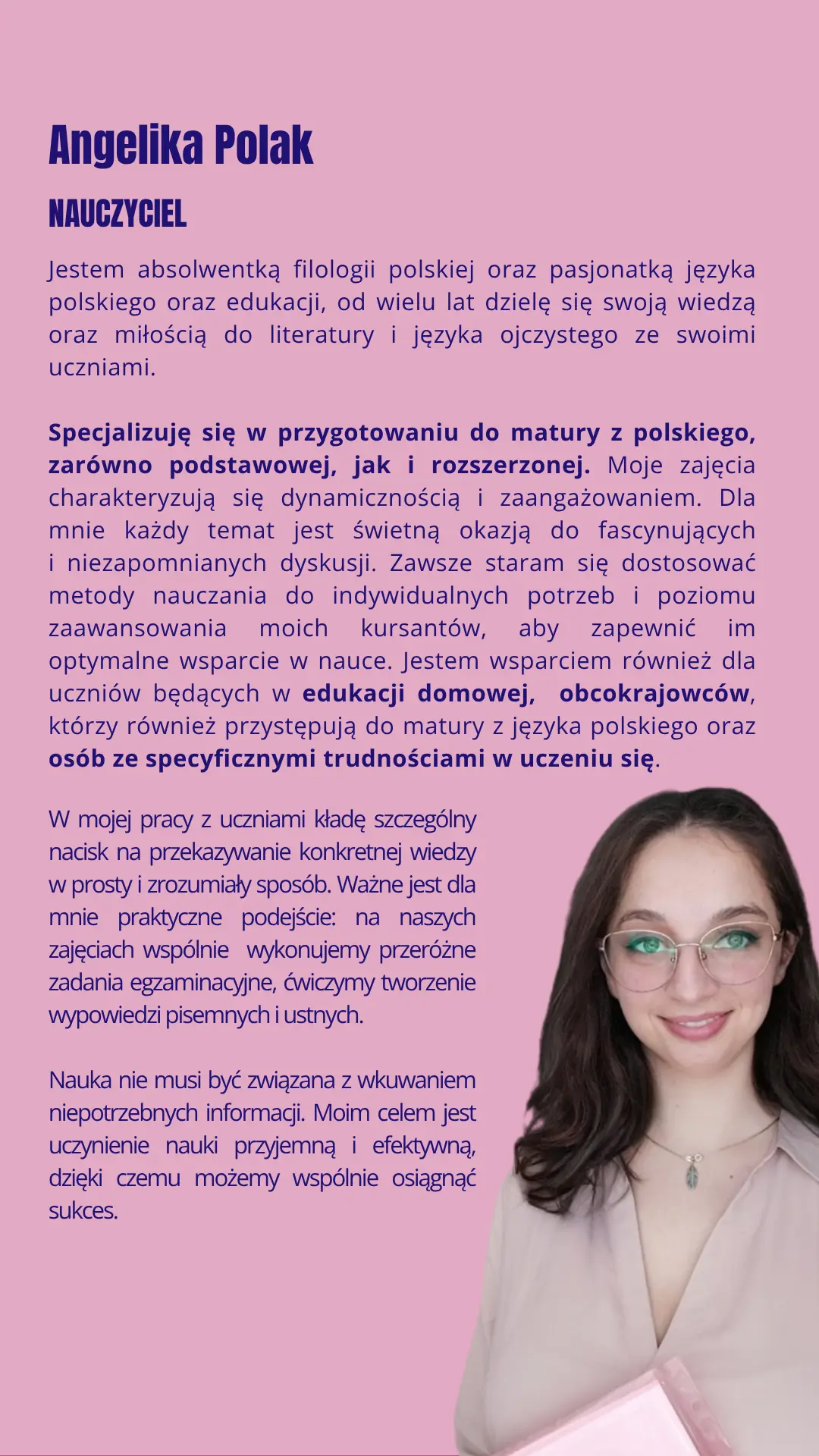 Poznaj swojego nauczyciela! Na lekcji skupimy się na Twoich oczekiwaniach i wyzwaniach, przed którymi stoisz. Zobaczysz, jak wygląda lekcja – jeśli np. masz problem z pisaniem wypracowań, pokażemy Ci, jak to zrobić krok po kroku. Kursanci często są zaskoczeni, że w ciągu kilkunastu minut dowiedzieli się więcej niż w szkole! Nasze sprawdzone metody przygotowały już setki maturzystów do egzaminu. Chcesz zobaczyć, jak to działa?