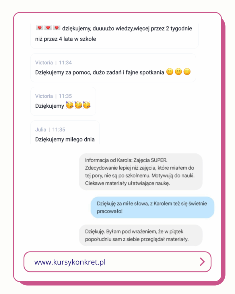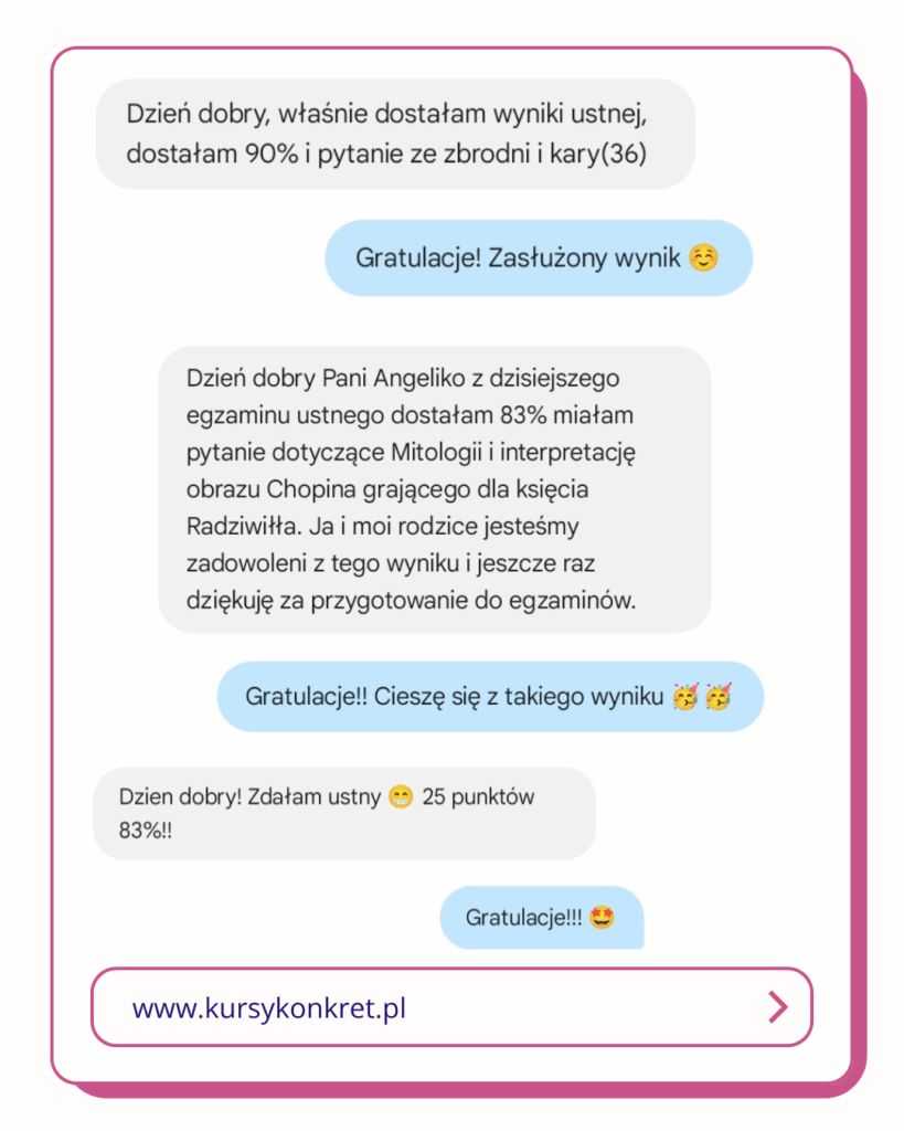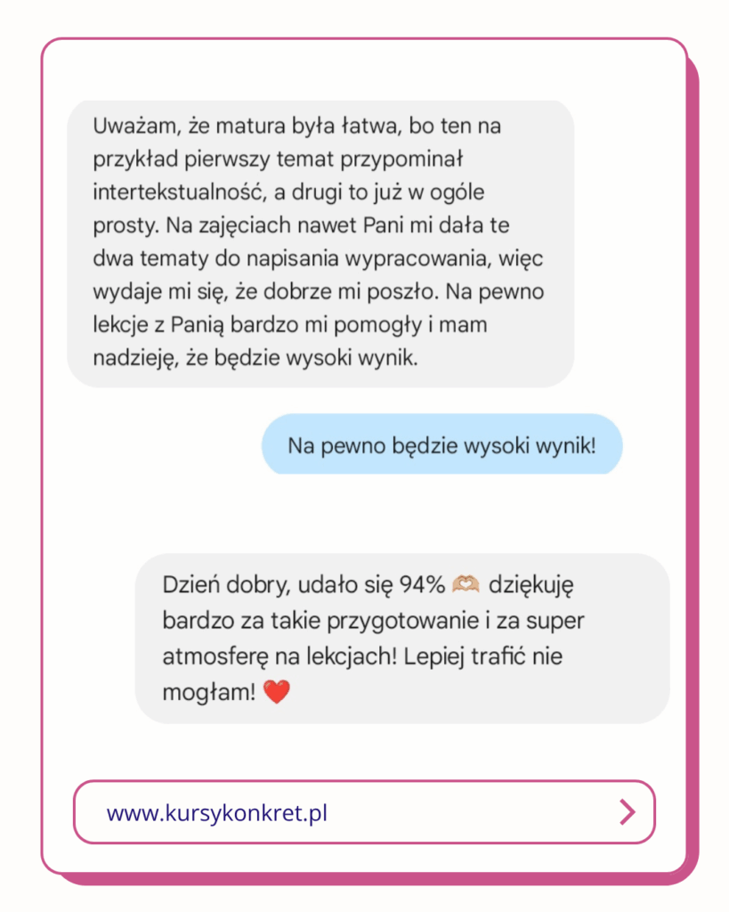 Od lat pracujemy indywidualnie z maturzystami i skupiamy się na tym, co naprawdę przynosi efekty, czego dowodem są sukcesy naszych uczniów. Ich słowa uznania są dla nas największą rekomendacją. Mamy świadomość, że za każdą otrzymaną wiadomością stoi konkretny uczeń. Taki, który bał się pisać, który nie wiedział, jak podejść do tematu i który czuł, że polski nie jest dla niego. Jednak krok po kroku, z indywidualnym wsparciem, uporządkowanym planem i pokazaniem metod zobaczył, że można!