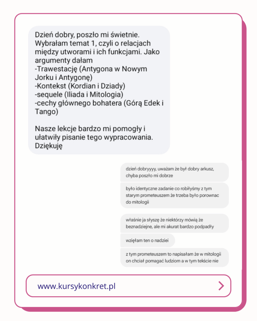 Dodatkowo chcemy się pochwalić, że już drugi rok z rzędu na maturze z języka polskiego pojawiło się niemal identyczne pytanie jak w naszym zbiorze zadań. To kolejny dowód na to, że nasz kurs naprawdę działa, a nasi kursanci, jak sami mówią, podchodzą do egzaminu z większym spokojem i pewnością siebie!